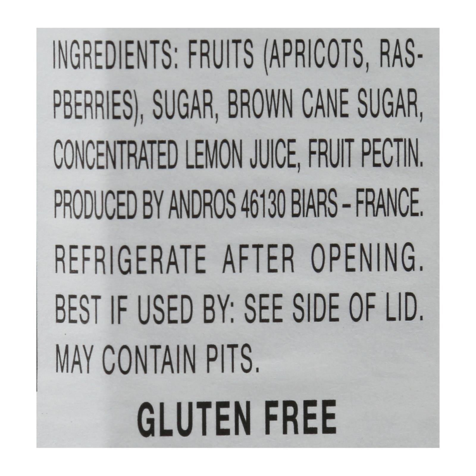 ingredients : fruits (apricots, raspberries);sugar;brown cane sugar;concentrated lemon juice;fruit pectin