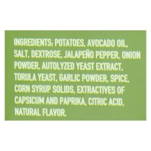 ingredients : potatoes;avocado oil;salt;dextrose;jalapeño pepper;onion powder;autolyzed yeast extract;torula yeast;garlic powder;spice;corn syrup solids;extractives of capsicum and paprika;citric acid;natural flavor