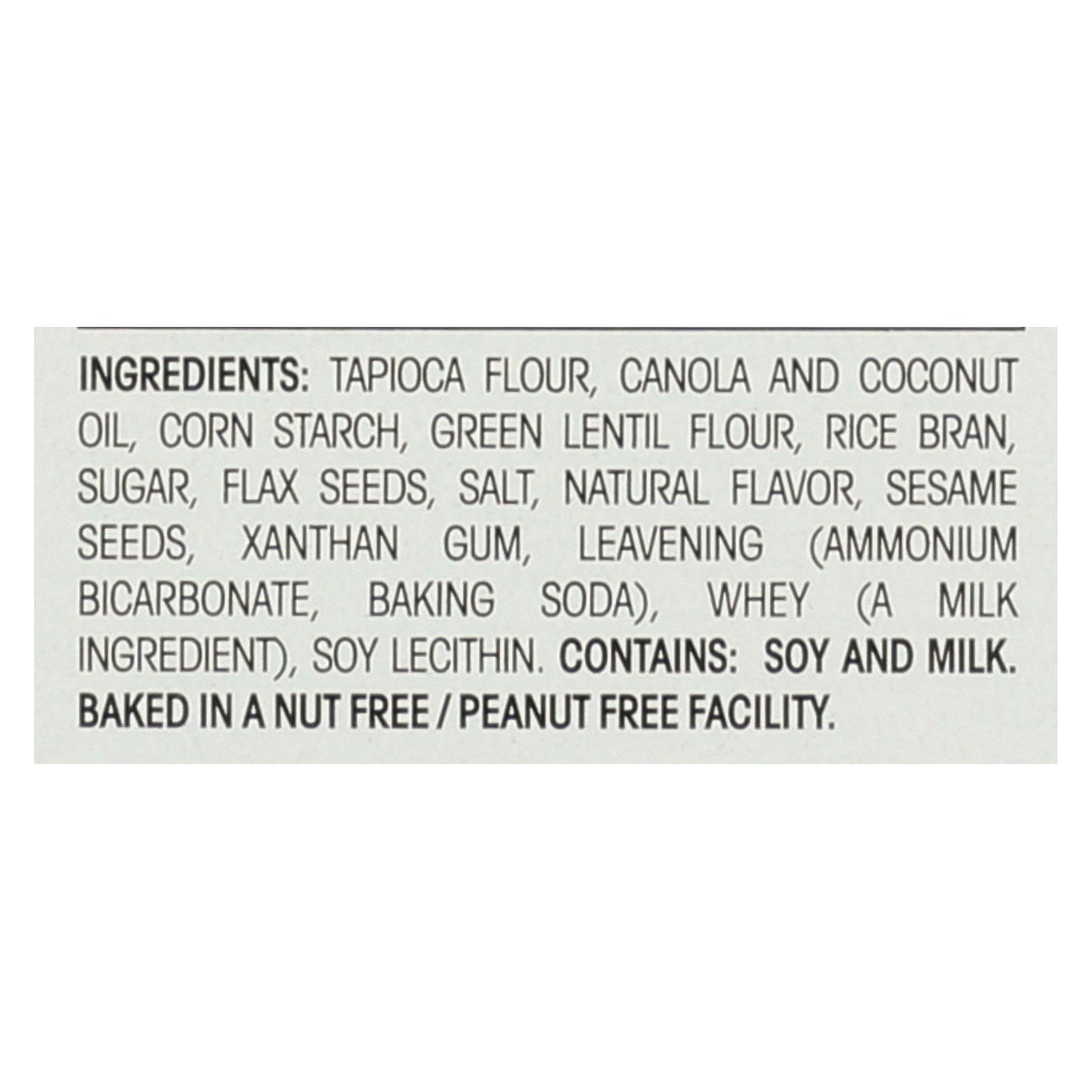 ingredients : tapioca flour;corn starch;canola and coconut oil;green lentil flour;rice bran;sugar;flax seeds;salt;natural flavor;sesame seeds;xanthan gum;leavening;ammonium bicarbonate;baking soda;whey;a milk ingredient;soy lecithin