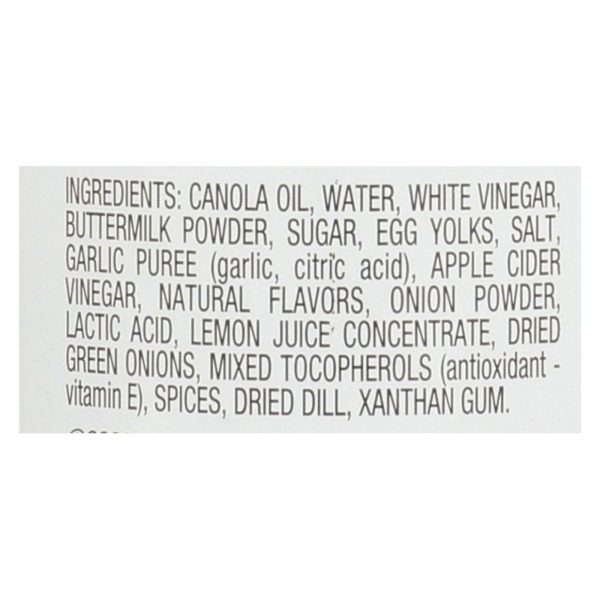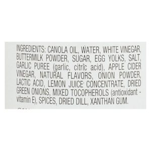 ingredients : canola oil;water;white vinegar;cane sugar;buttermilk powder;egg yolks;salt;garlic puree;garlic;citric acid;apple cider vinegar;natural flavors;onion powder;lactic acid;lemon juice concentrate;dried green onions;potassium sorbate and sodium benzoate;to preserve freshness;mixed tocopherols;antioxidant-vitamin e;spices;dried dill;xanthan gum