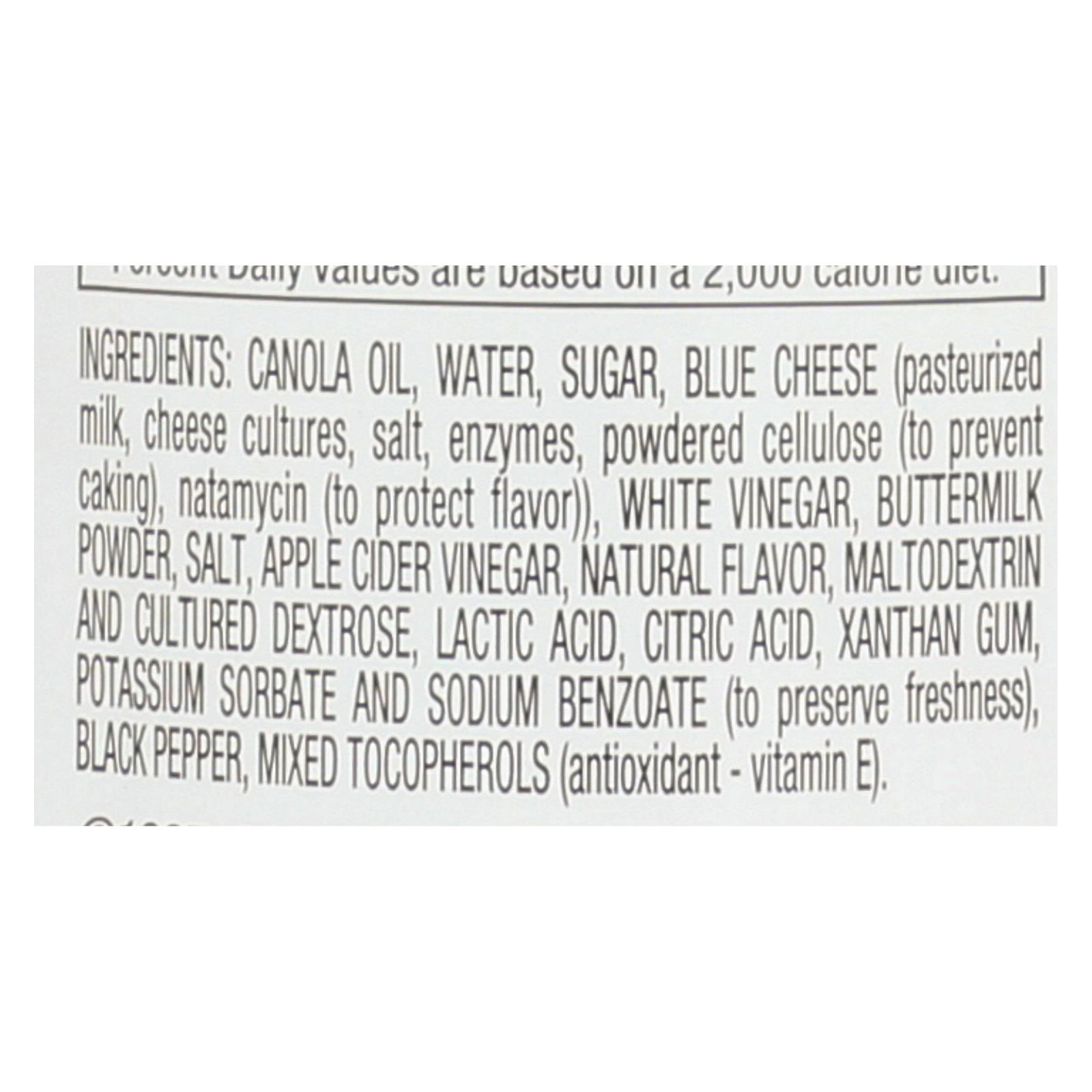 ingredients : canola oil;water;blue cheese;pasteurized milk;cheese cultures;salt;enzymes;penicillium roquefortii;powdered cellulose;too prevent caking;cane sugar;white vinegar;buttermilk powder;apple cider vinegar;natural flavor;lactic acid;maltodextrin and cultured dextrose;citric acid;xanthan gum;black pepper;potassium sorbate and sodium benzoate;to preserve freshness;mixed tocopherols;antioxidant – vitamin e