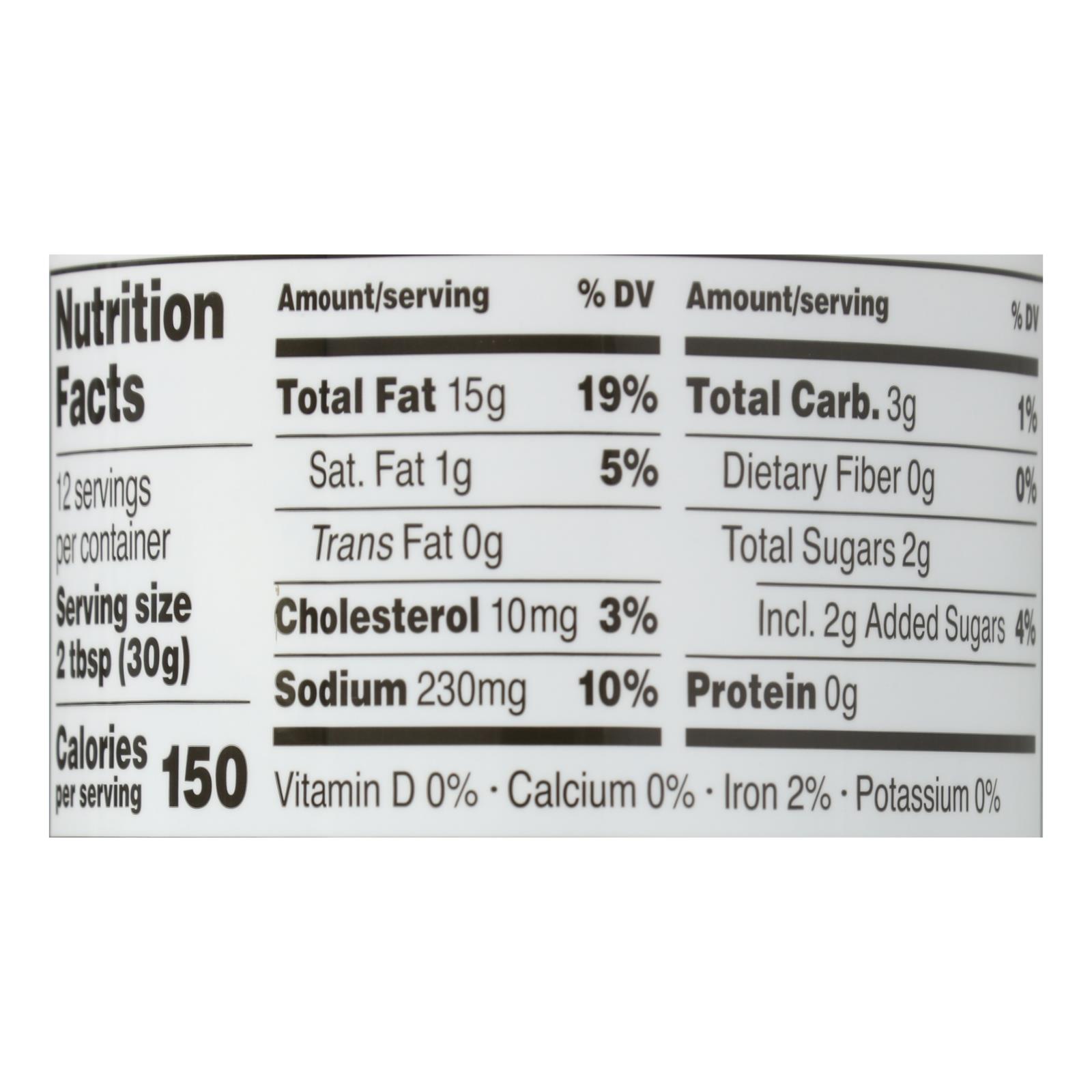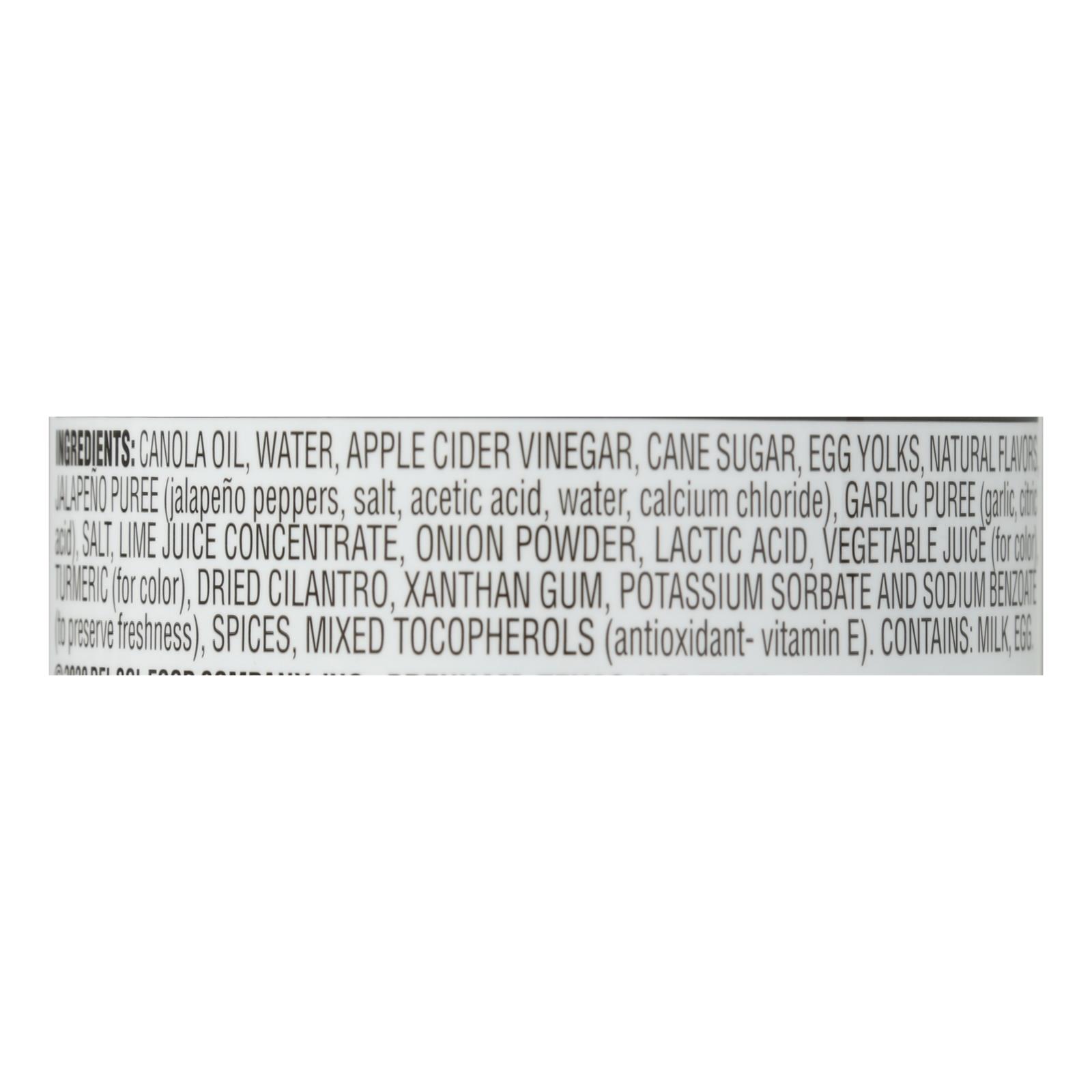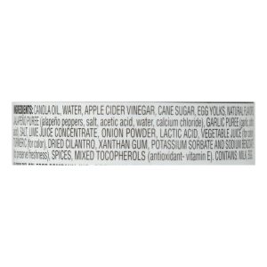 ingredients : canola oil;water;apple cider vinegar;cane sugar;egg yolks;natural flavors;jalapeno puree (jalapeno peppers, salt, acetic acid, water, calcium chloride);garlic puree (garlic, citric acid);salt;lime;juice concentrate;onion powder;lactic acid;vegetable juice (for color);turmeric (for color);dried cilantro;xanthan gum;potassium sorbate and sodium benzoate (to preserve freshness);spices;mixed tocopherols (antioxidants- vitamin e)