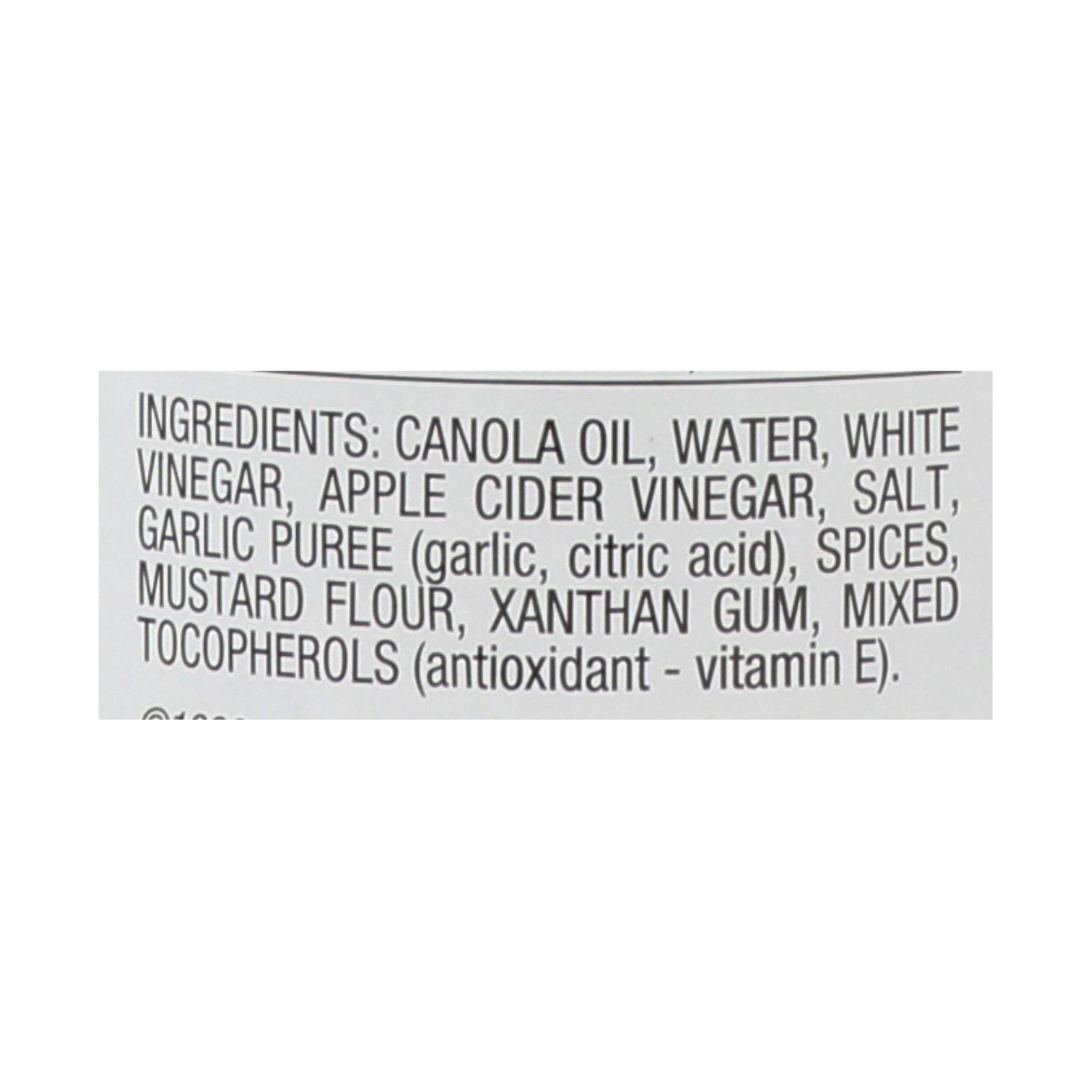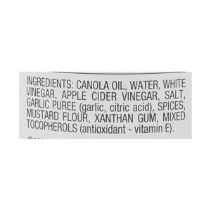 ingredients : canola oil;water;white vinegar;apple cider vinegar;salt;garlic puree;garlic;citric acid;spices;mustard flour;xanthan gum;mixed tocopherols;antioxidant – vitamin e