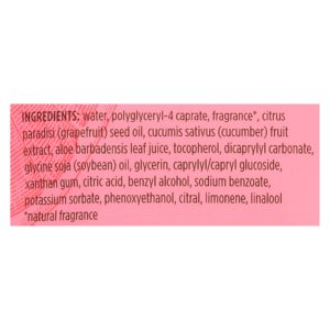 ingredients : water;polyglyceryl-4 caprate;fragrance;citrus paradise (grapefruit) seed oil;cucumis sativus (cucumber) fruit extract;aloe barbadensis leaf juice;tocopherol;dicaprylyl carbonate;glycine soja (soybean) oil;glycerin;caprylyl/capryl glucoside;xanthan gum;citric acid;benzyl alcohol;sodium benzoate;potassium sorbate;phenoxyethanol;citral;limonene;linalool