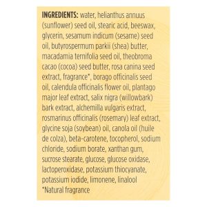 ingredients : water;helianthus annuus (sunflower) seed oil;stearic acid;beeswax;glycerin;sesamum indicum (sesame) seed oil;butyrospermum parkii (shea) butter;macadamia ternifolia seed oil;theobroma cacao (cocoa) seed butter;rosa canina seed extract;fragrance;borago officinalis seed oil;calendula officinalis flower oil;plantago major leaf extract;salix nigra (willowbark) bark extract;alchemilla vulgaris extract;rosmarinus officinalis (rosemary) leaf extract;glycine soja (soybean) oil;canola oil (huile de colza