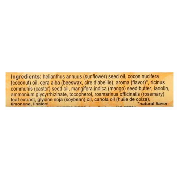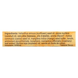 ingredients : helianthus annuus (sunflower) seed oil;cocos nucifera (coconut) oil;cera alba (beeswax, cire d’abeille);aroma (flavor);ricinus communis (castor) seed oil;mangifera indica (mango) seed butter;lanolin;ammonium glycyrrhizinate;tocopherol;rosmarinus officinalis (rosemary) leaf extract;glycine soja (soybean) oil;canola oil (huile de colza);limonene;linalool