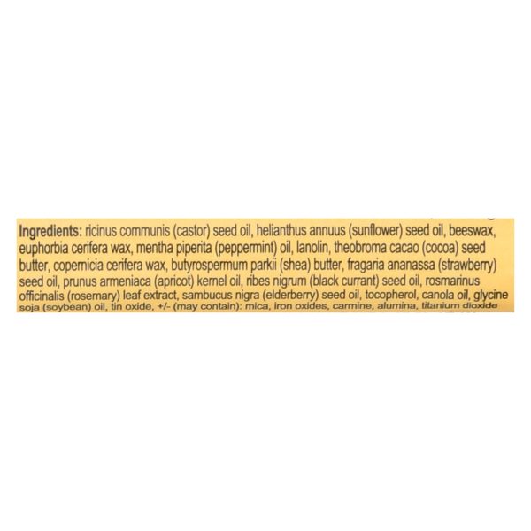 ingredients : ricinus communis (castor) seed oil;helianthus annuus (sunflower) seed oil;cera alba [beeswax];candelilla cera [euphorbia cerifera (candelilla) wax];mentha piperita (peppermint) oil;lanolin;ci 77891 [titanium dioxide];theobroma cacao (cocoa) seed butter;copernicia cerifera (carnauba) wax;mica;butyrospermum parkii (shea) butter;fragaria ananassa (strawberry) seed oil;prunus armeniaca (apricot) kernel oil;ribes nigrum (black currant) seed oil;rosmarinus officinalis (rosemary) leaf extract;sambucus