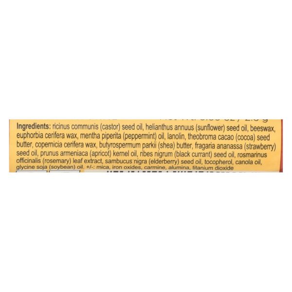 ingredients : ricinus communis (castor) seed oil;helianthus annuus (sunflower) seed oil;cera alba [beeswax];mica;candelilla cera [euphorbia cerifera (candelilla) wax];mentha piperita (peppermint) oil;lanolin;ci 77891 [titanium dioxide];theobroma cacao (cocoa) seed butter;copernicia cerifera (carnauba) wax;ci 77491 [iron oxide];butyrospermum parkii (shea) butter;fragaria ananassa (strawberry) seed oil;prunus armeniaca (apricot) kernel oil;ribes nigrum (black currant) seed oil;rosmarinus officinalis (rosemary)
