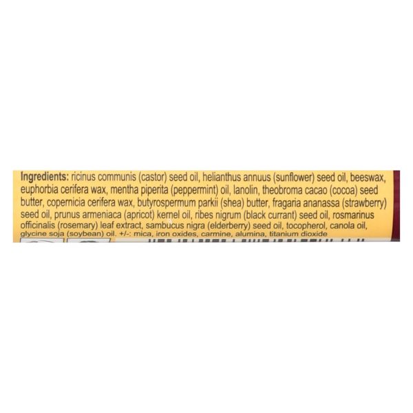 ingredients : ricinus communis (castor) seed oil;helianthus annuus (sunflower) seed oil;cera alba [beeswax];candelilla cera [euphorbia cerifera (candelilla) wax];mentha piperita (peppermint) oil;lanolin;ci 77491 [iron oxide];theobroma cacao (cocoa) seed butter;copernicia cerifera (carnauba) wax;mica;butyrospermum parkii (shea) butter;ci 75470 [carmine];fragaria ananassa (strawberry) seed oil;prunus armeniaca (apricot) kernel oil;ribes nigrum (black currant) seed oil;rosmarinus officinalis (rosemary) leaf extr