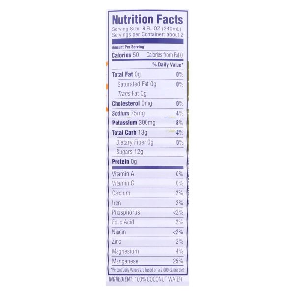 C2o pure coconut water contains 100% natural coconut water. It is free of fat, sugar, sweeteners and cholesterol. It is also gluten-free, gmo-free and ph neutral. Each 8 oz. Serving of c2o pure coconut water provides 8% of the daily recommended amount of potassium and 24% of the daily recommended amount of manganese. Fresh from thailand’s inland coconut groves, each 17.5 fl. Oz. Can of c2o pure coconut water delivers a unique, full-flavor profile and naturally occurring electrolytes.