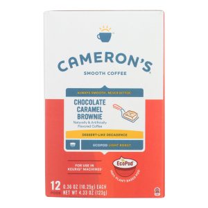 Cameron’s specialty coffee, chocolate caramel brownie has a light roast, full-filter flavor for better taste, less waste. This 100% certified specialty grade arabica coffee is kosher, gluten-free and allergen free. Not only is this blend delicious, the pods use renewable, plant-based materials including compostable lids and rings. Each box of cameron’s specialty coffee, chocolate caramel brownie contains 12 pods with 0.36 oz. Of product in each pod. See nutrition facts panel for warnings.