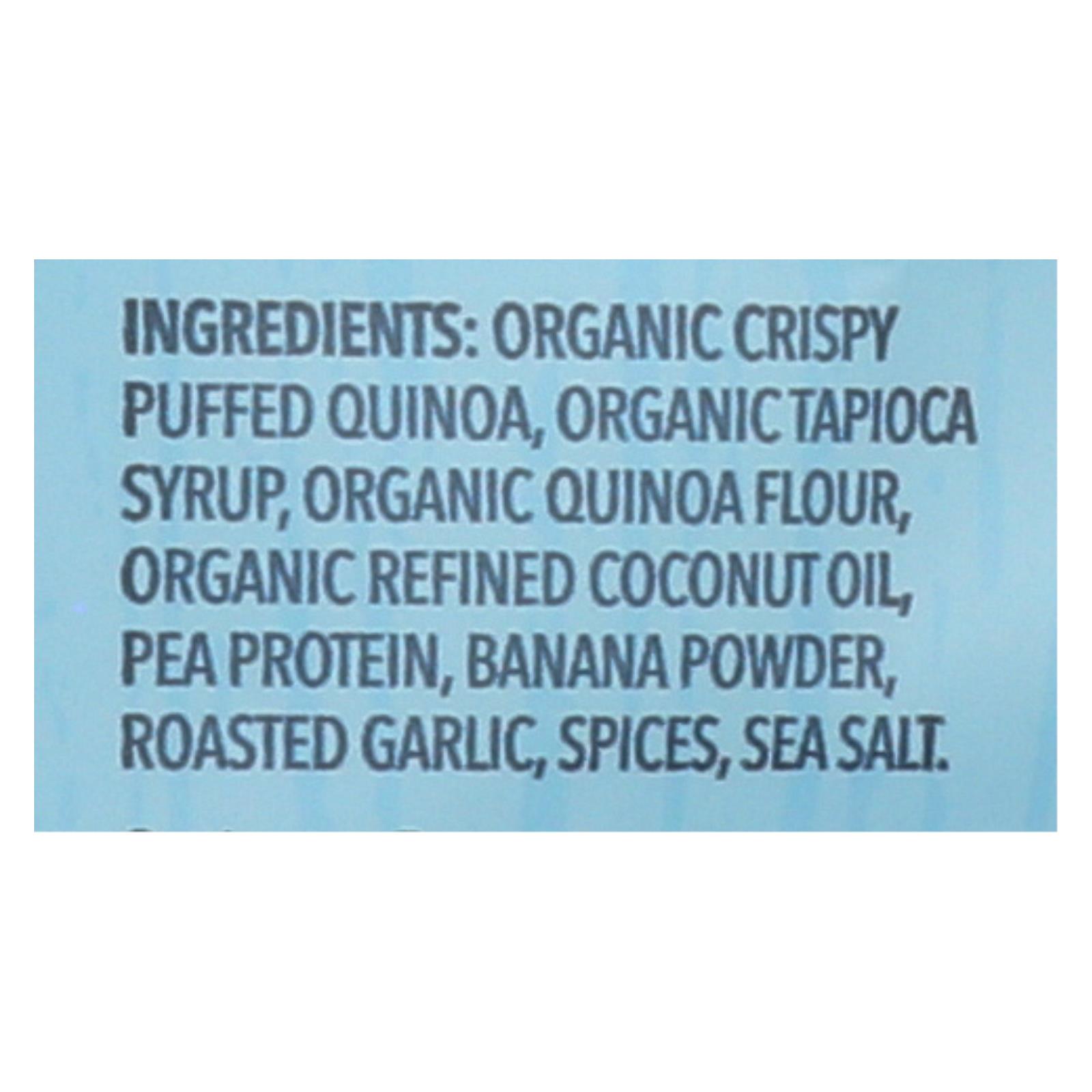 ingredients : organic crispy puffed quinoa;organic tapioca syrup;organic quinoa flour;organic refined coconut oil;pea protein;banana powder;roasted garlic;spices;sea salt