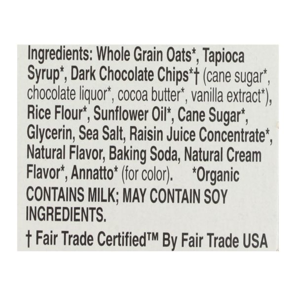 ingredients : whole grain oats;tapioca syrup;dark chocolate chips* (cane sugar*, chocolate liquor*, cocoa butter*, vanilla extract*);rice flour;sunflower oil;cane sugar;glycerin;sea salt;raisin juice concentrate;baking soda;natural flavor;natural cream flavor;annatto* (for color)