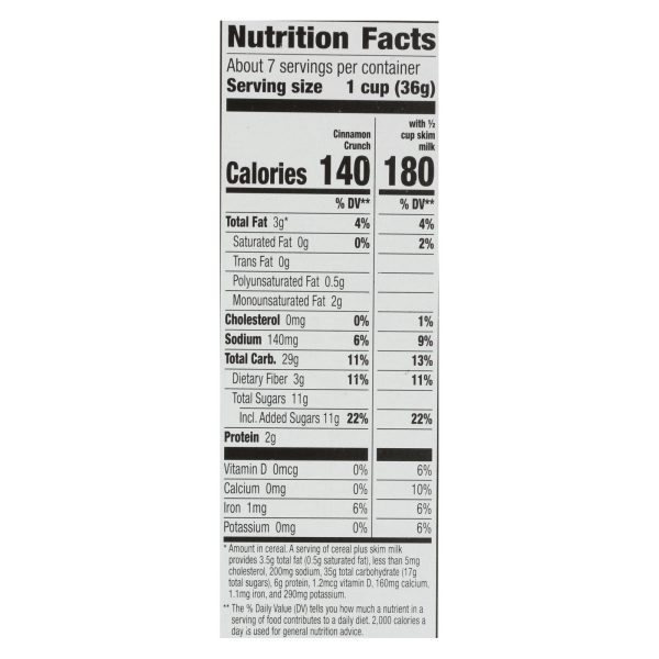 Cascadian farm cinnamon crunch is a natural and delicious breakfast cereal. Made primarily with natural ingredients, cascadian farm cinnamon crunch is largely free of unnatural and unnecessary additives. This product is organic, whole-grain and non-gmo. Each box of cascadian farm cinnamon crunch weighs 9.2 oz. With nine servings per container and 110 calories per serving. See nutrition facts panel for allergens.