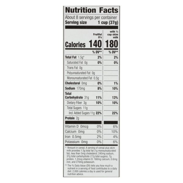 Cascadian farm fruitful o’s, naturally fruit flavored sweetened organic corn & oat cereal is a healthy and delicious breakfast cereal. Made primarily from natural ingredients, this cereal is largely free of unnatural and unnecessary additives. This product is non-gmo, organic and kosher. Each box of cascadian farm fruitful o’s, naturally fruit flavored sweetened organic corn & oat cereal weighs 10.2 oz. With 10 servings per box and 100 calories per serving. See nutrition facts panel for allergens.