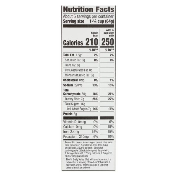 Cascadian farm organic wheat bran flakes with plump organic raisins is a healthy and delicious breakfast option. Made primarily with natural ingredients, this cereal is largely free of unnatural and unnecessary additives. This product is kosher, whole-grain and non-gmo. Each box of cascadian farm organic wheat bran flakes with plump organic raisins weighs 12 oz. With six servings per box and 180 calories per serving. See nutrition facts panel for allergens.