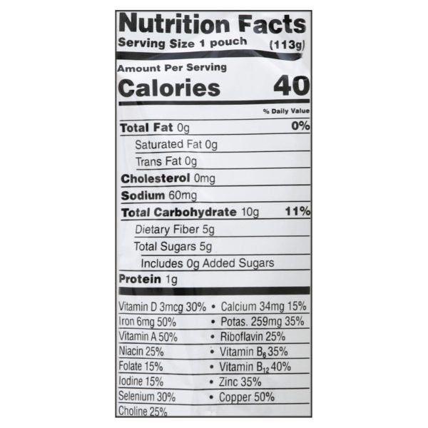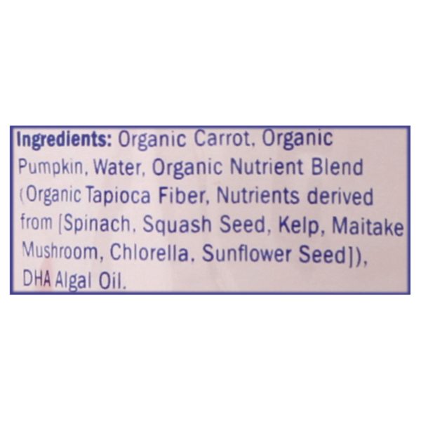 ingredients : organic carrots;organic pumpkin;water;organic nutrient blend (organic tapioca fiber, nutrients derived from [spinach, broccoli, squash seeds, cranberries, maitake mushrooms, chlorella, sunflower seeds]);dha algal oil
