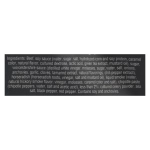 ingredients : beef;soy sauce (water, sugar, salt, hydrolyzed corn and soy protein, caramel color, natural flavor, cultured dextrose, lactic acid, green tea extract, mustard oil);sugar;worcestershire sauce (distilled white vinegar, molasses, sugar, water, salt, onions, anchovies, garlic, cloves, tamarind extract, natural flavorings, chili pepper extract);horseradish (horseradish roots, vinegar, salt and mustard oil);liquid smoke (water, natural hickory smoke flavor, vinegar, molasses, caramel color and salt);c