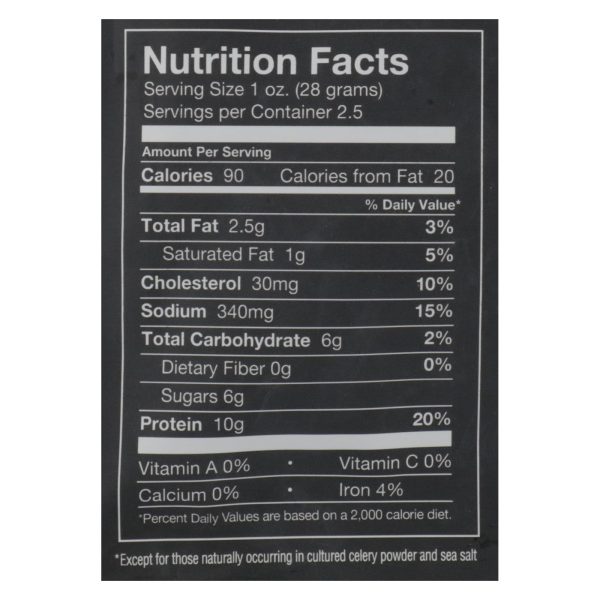 Chef’s cut real jerky, real jerky, steak chipotle pepper is made from premium beef. This product is chef crafted, made from premium cuts and free of gluten and added nitrites. Chef’s cut real jerky, real jerky, steak chipotle pepper is great as an on-the-go snack in a 2.5 oz. Pouch and contains only 100 calories per 1 oz. Serving. This product is also a good source of protein, containing 12 g. Per serving. Please see nutritional fact panel for any possible allergens associated with chef’s cut real jerky, real jerky, steak chipotle pepper.