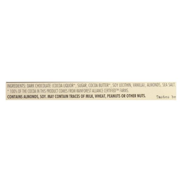 ingredients : dark chocolate (cocoa liquor*, sugar, cocoa butter*, soy lecithin, vanilla);almonds;sea salt