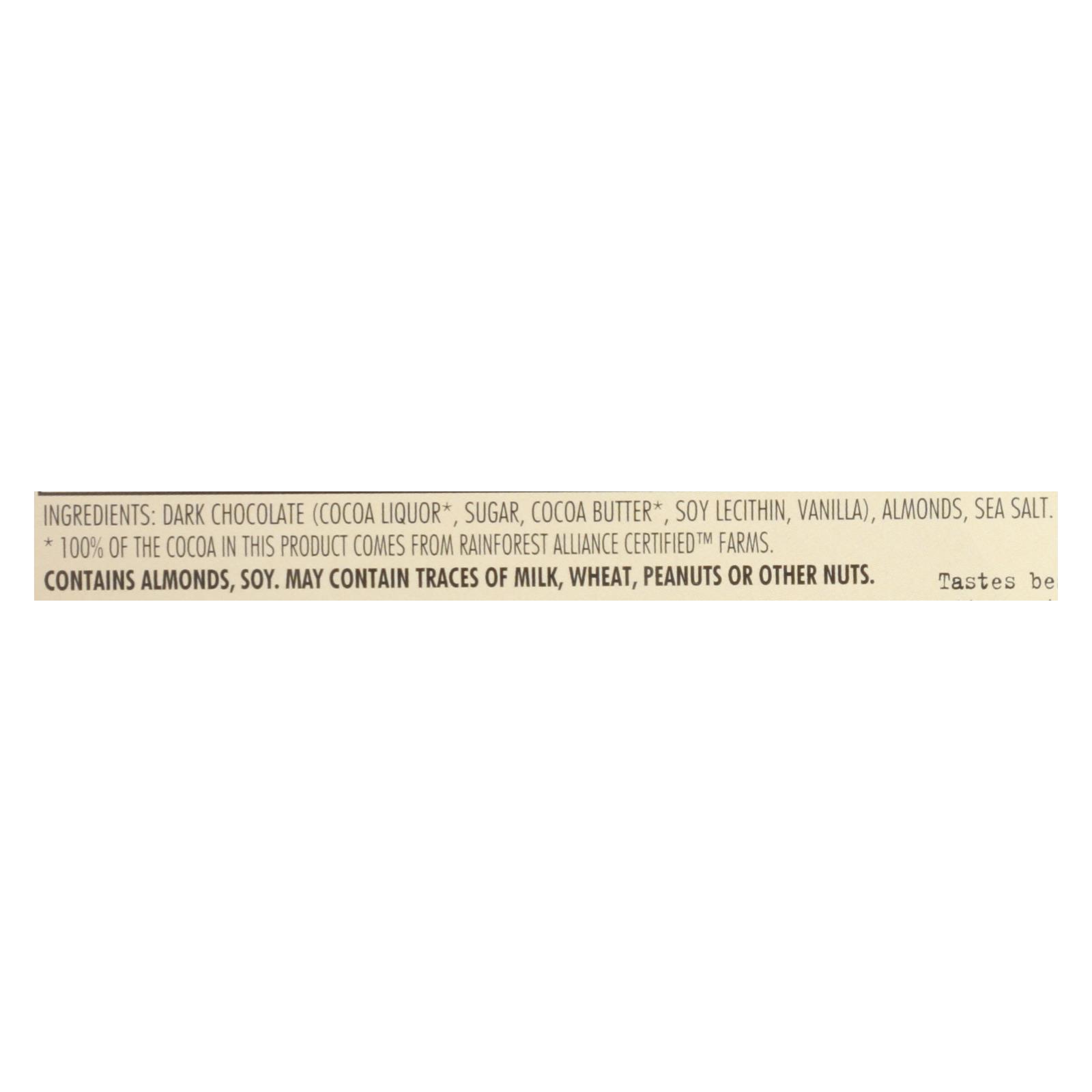 Chocolove almonds and sea salt in dark chocolate bar is a 3.2 oz. Bar with dark semisweet chocolate, whole dry roasted almonds and sea salt. At first bite, crunchy almonds release their flavor in a swirl with chocolate. The sea salt crystals continually reset your sweet taste buds and make a tantalizing taste combination that keeps you wanting more. Our chocolate is made with cocoa certified by imo as for life, which means it was farmed in a socially responsible and ethical manner. All of the cocoa bean derived ingredients in this chocolate are certified for life. See the nutrition facts panel for allergens.