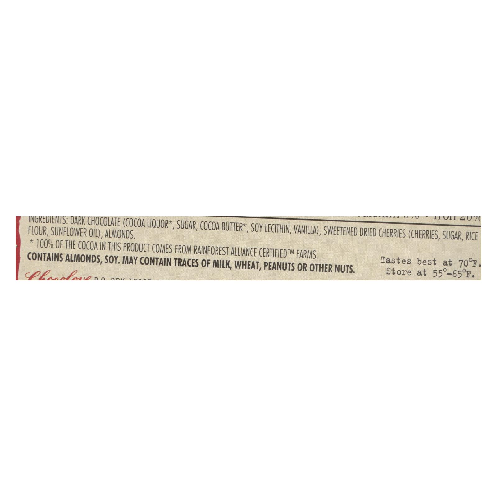 Chocolove cherries & almonds in dark chocolate bar is a 3.2 oz. Bar that contains cherries and dry roasted almonds in belgian dark chocolate crafted from african cocoa beans. The chewy, crunchy combination of cherries and almonds provides a delicious flavor contrast then gradually blends into the complex flavors of dark chocolate. Our chocolate is made with cocoa certified by imo as for life, which means it was farmed in a socially responsible and ethical manner. All of the cocoa bean derived ingredients in this chocolate are certified for life. See the nutrition facts panel for allergens.