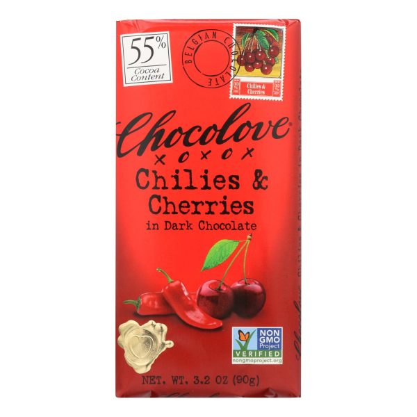 Chocolove chilies and cherries in dark chocolate bar is a 3.2 oz. Bar made with ancho and chipotle chilies that supply the heat, and dried cherries that supply the sweet, in this deliciously exciting chocolate. Initial chili flavors transition to a deep sweet cherry and finish again on a pleasantly warm note. The stimulating effects of chilies and chocolate will warm your heart. Our chocolate is made with cocoa certified by imo as for life, which means it was farmed in a socially responsible and ethical manner. All of the cocoa bean derived ingredients in this chocolate are certified for life. See the nutrition facts panel for allergens.