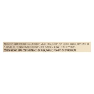 ingredients : dark chocolate (cocoa liquor*, sugar, cocoa butter*, soy lecithin, vanilla);peppermint oil