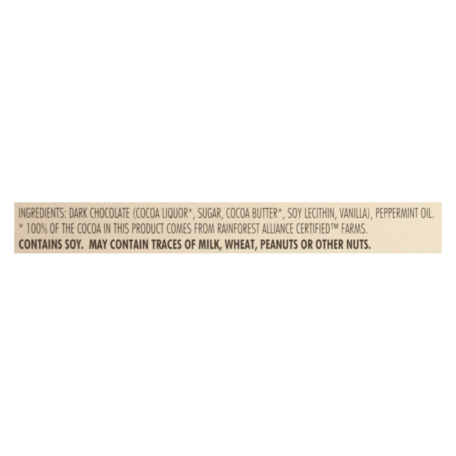 Chocolove peppermint in dark chocolate bar is a 3.2 oz. Bar of dark semisweet chocolate and natural peppermint oil. Creamy dark chocolate gives way to refreshing natural peppermint, and the flavors of chocolate and peppermint swirl on your palate, ending in a cool mint finish. Our chocolate is made with cocoa certified by imo as for life, which means it was farmed in a socially responsible and ethical manner. All of the cocoa bean derived ingredients in this chocolate are certified for life. See the nutrition facts panel for allergens.