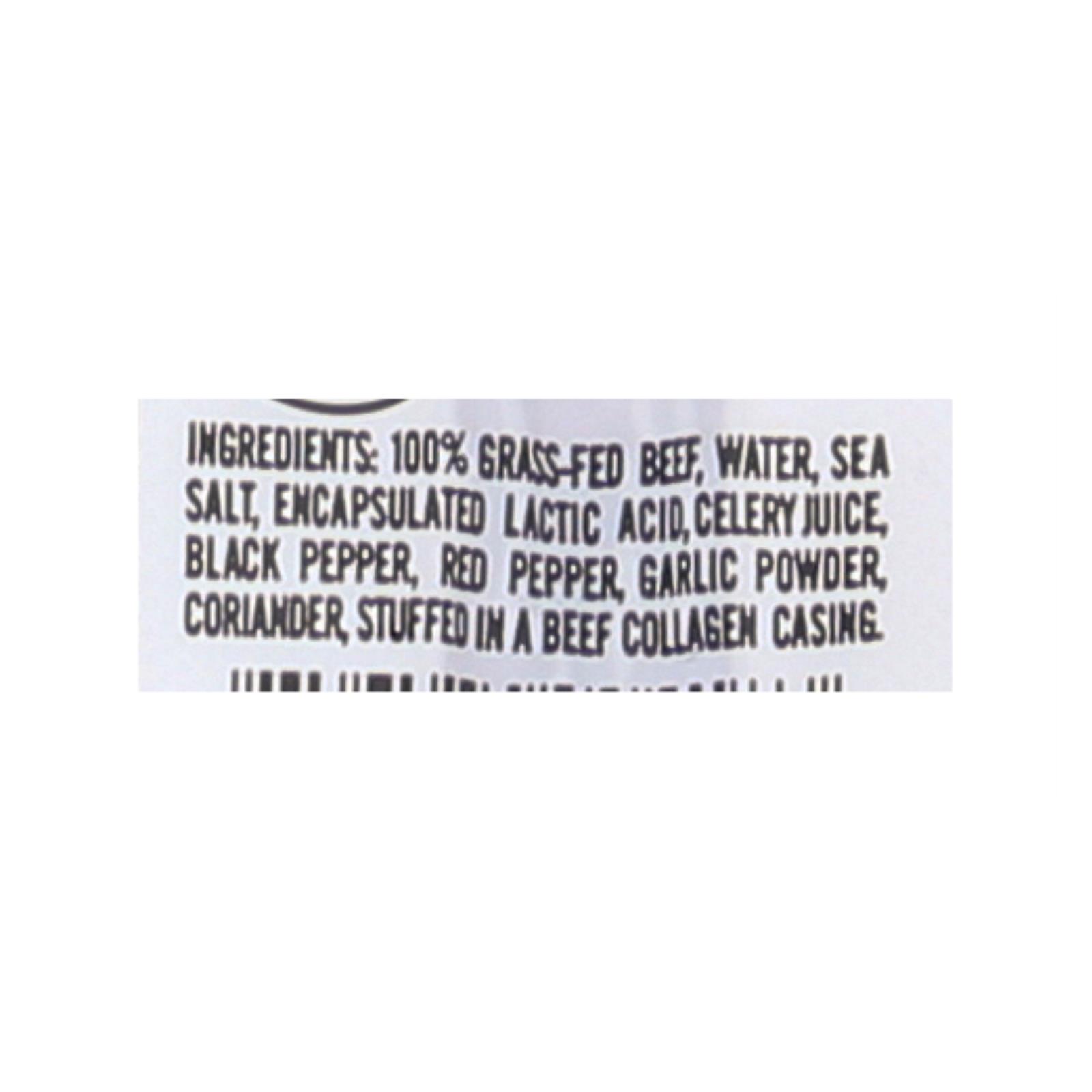 ingredients : grass fed & finished beef;water;sea salt;encapsulated lactic acid;cultured celery powder (celery powder, sea salt);black pepper;red pepper;garlic powder;coriander;stuffed in a beef collagen casing