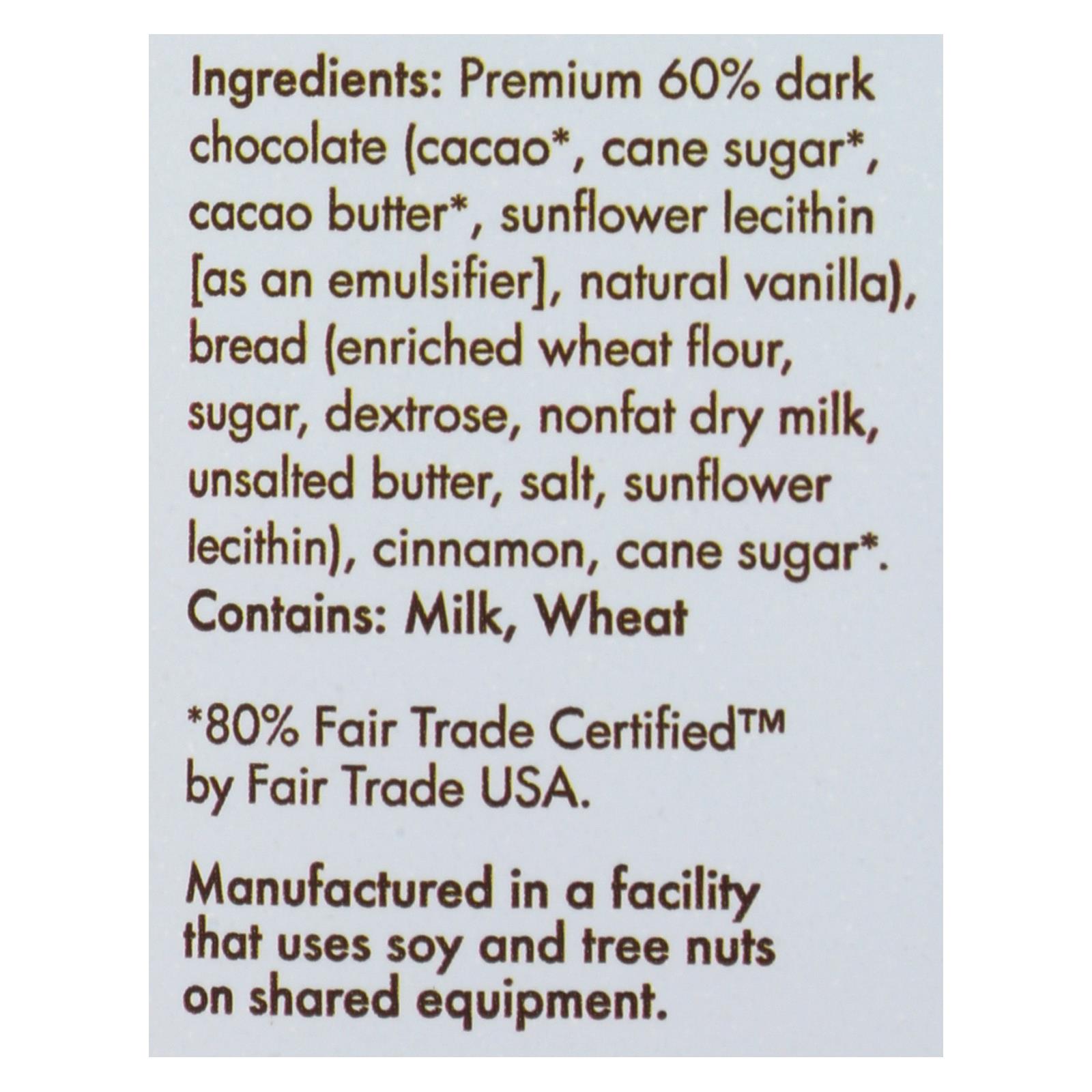 ingredients : premium 60% dark chocolate;cacao;cane sugar;cacao butter;sunflower lecithin [as an emulsifier];natural vanilla;bread;enriched wheat flour;sugar;dextrose;nonfat dry milk;unsalted butter;salt;sunflower lecithin;cinnamon