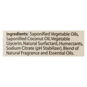 ingredients : saponified vegetable oils;saponified coconut oil;vegetable glycerin;natural surfactant;humectants;sodium citrate;ph stabilizer;blend of natural fragrance and essential oils