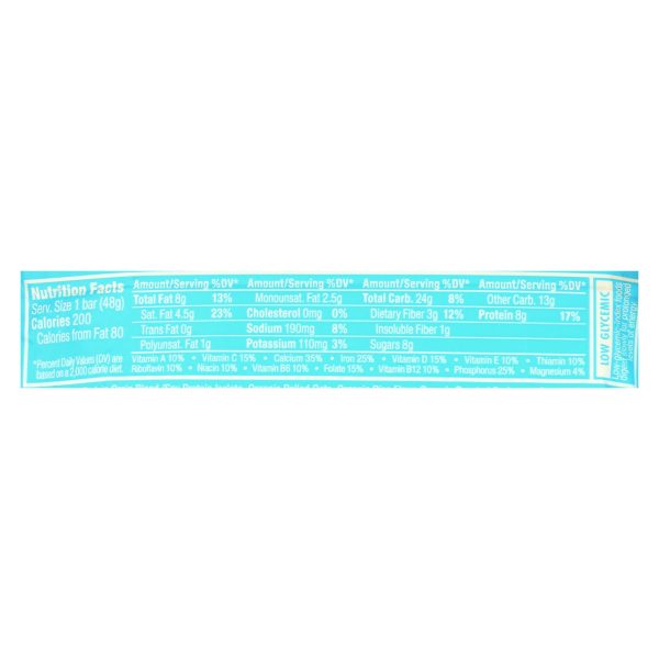 ingredients : protein grain blend;organic rolled oats;soy protein isolate;organic rice flour;organic roasted soybeans;organic soy flour;organic brown rice syrup;organic cane sugar;chicory fiber syrup;organic virgin coconut oil;vegetable glycerin;organic high oleic sunflower oil;organic cane syrup;organic cocoa;organic palm kernel solids;palm kernel oil;organic coconut;sea salt;natural flavors;soy lecithin