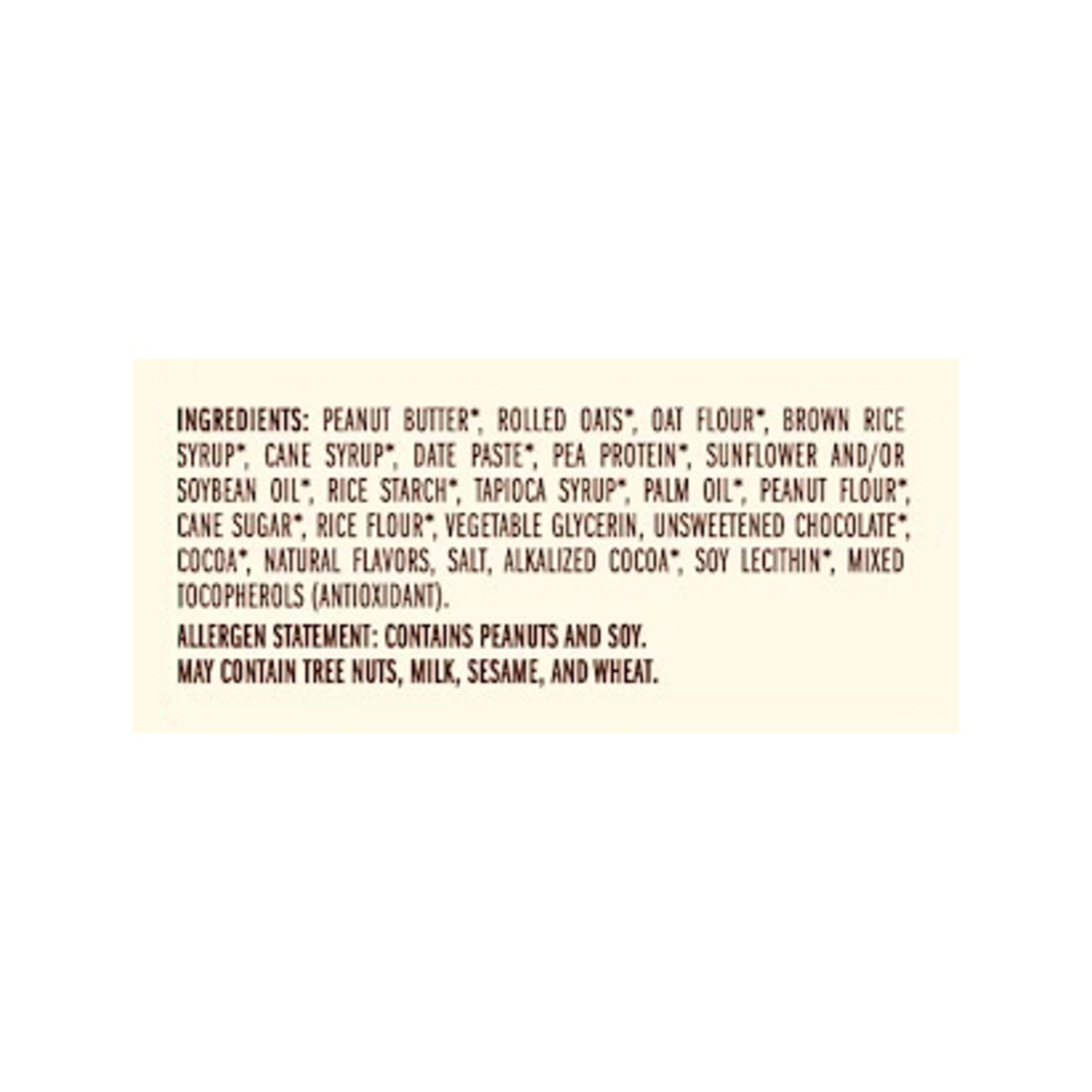 ingredients : peanut butter;rolled oats;oat flour;brown rice syrup;cane syrup;date paste;pea protein;high oleic sunflower oil;rice starch;tapioca syrup;palm oil;peanut flour;cane sugar;rice flour;vegetable glycerin;unsweetened chocolate;cocoa;natural flavors;sea salt;alkalized cocoa;sunflower lecithin;mixed tocopherols;antioxidant