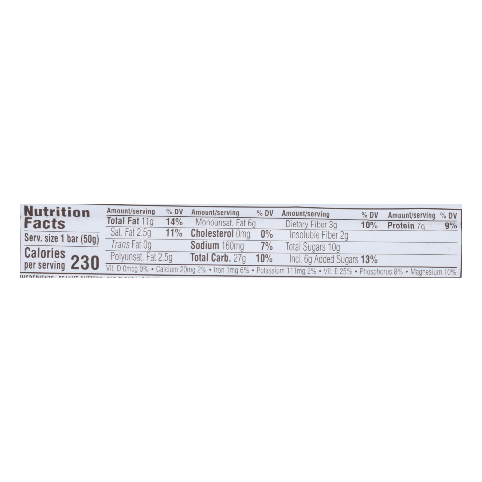 ingredients : organic peanut butter;organic oat flour;organic rolled oats;organic brown rice syrup;organic date paste;organic cane syrup;organic tapioca syrup;organic pea protein;organic rice starch;organic high oleic sunflower oil;organic palm oil;organic peanut flour;organic dried cane syrup;organic rice flour;organic brown rice protein;natural flavors;vegetable glycerin;organic peanuts;sea salt;sunflower lecithin;mixed tocopherols;antioxidant
