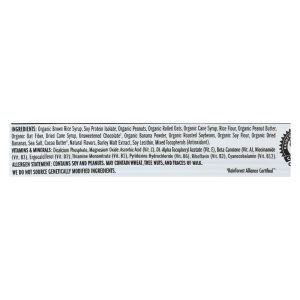 ingredients : dicalcium phosphate;magnesium oxide;ascorbic acid (vit. C);dl alpha tocopheryl acetate (vit. E);beta carotene (vit. A);niacinamide (vit. B3);ergocalciferol (vit. D2);thiamine mononitrate (vit. B1);pyridoxine hydrochloride (vit. B6);riboflavin (vit. B2);cyanocobalamin (vit. B12);organic brown rice syrup;soy protein isolate;organic peanuts;organic rolled oats;organic cane syrup;rice flour;organic peanut butter;organic oat fiber;dried cane syrup;unsweetened chocolate ;organic banana powder;organic