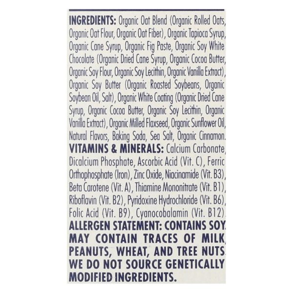 ingredients : calcium carbonate;dicalcium phosphate;ascorbic acid;vit. C;ferric orthophosphate;iron;zinc oxide;niacinamide;vit. B3;beta carotene;vit. A;thiamine mononitrate;vit. B1;riboflavin;vit. B2;pyridoxine hydrochloride;vit.b6;folic acid;vit. B9;cyanocobalamin;vit. B12;organic oat blend;organic rolled oats;organic oat flour;organic oat fiber;organic tapioca syrup;organic cane syrup;organic fig paste;organic soy white chocolate;organic dried cane syrup;organic cocoa butter;organic soy flour;organic soy le