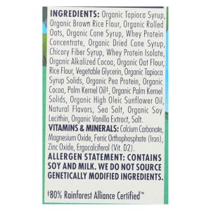 ingredients : calcium carbonate;magnesium oxide;ferric orthophosphate;iron;zinc oxide;ergocalciferol;vit. D2;organic tapioca syrup;organic brown rice flour;organic rolled oats;organic cane syrup;whey protein concentrate;organic dried cane syrup;chicory fiber syrup;whey protein isolate;organic alkalized cocoa;organic oat flour;rice flour;vegetable glycerin;organic tapioca syrup solids;organic pea protein;organic cocoa;palm kernel oil ;organic palm kernel solids;organic high oleic sunflower oil;natural flavors;