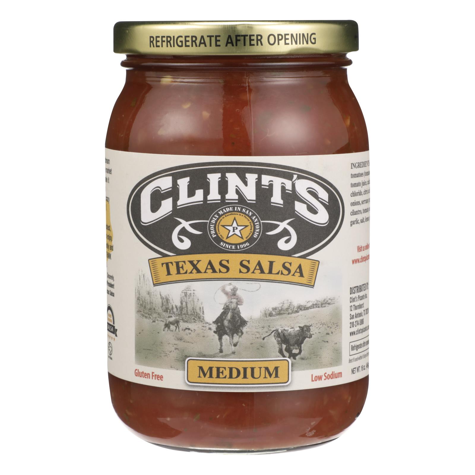 Clint’s medium texas salsa contains a blend of tomatoes, serrano peppers, cilantro, lemon juice and other seasonings that create e a flavorful salsa with a fresh taste. Our recipe has only 5 calories per serving and 0 g. Of fat, so you can enjoy it as a dip, marinade or side dish without straying from your healthy diet. This jar contains 16 oz. Of salsa that’s made with all natural ingredients.