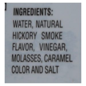 ingredients : water;natural hickory smoke flavor;vinegar;molasses;caramel color and salt