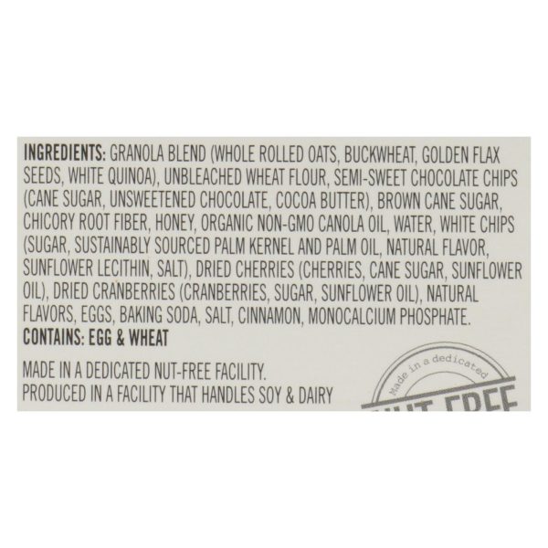 ingredients : granola blend (whole rolled oats, buckwheat, golden flax seeds, white quinoa);unbleached wheat flour;semi-sweet chocolate chips (cane sugar, unsweetened chocolate, cocoa butter);brown cane sugar;chicory root fiber;honey;organic non-gmo canola oil;water;white chips (sugar, sustainably sourced palm kernel and palm oil, natural flavor, sunflower lecithin, salt);dried cherries (cherries, cane sugar, sunflower oil);dried cranberries (cranberries, sugar, sunflower oil);natural flavors;eggs;baking soda