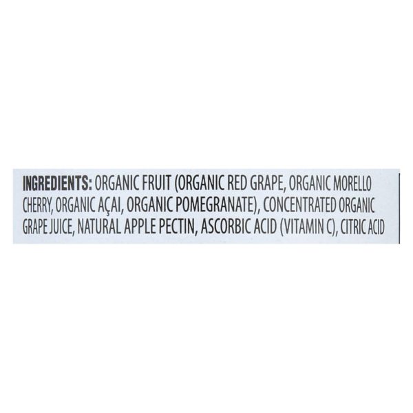 ingredients : organic fruit (organic red grape concentrate, organic morello cherry, organic acai, organic pomegranate concentrate);organic apple juice concentrate;apple pectin;ascorbic acid (vitamin c);citric acid