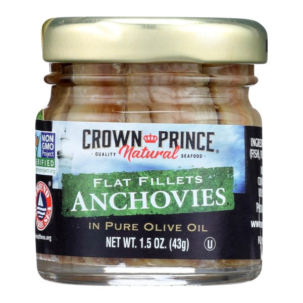 Crown prince natural flat fillets anchovies enhance your cooking with a bold hit of savory umami flavor. We harvest these fish in the wild, then pack them in pure olive oil and salt, and seal them in a glass jar to preserve the flavor. Mince a single fillet into a creamy pasta sauce to develop delectable flavor, or mix it into dressing for a classic caesar salad. This jar contains 1.5 ounces of anchovy fillets.
