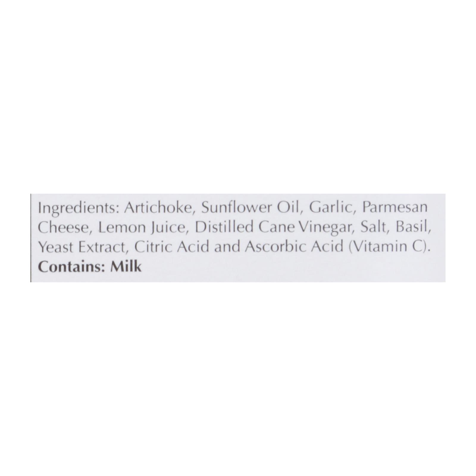 ingredients : artichoke;sunflower oil;garlic;parmesan cheese;lemon juice;distilled cane vinegar;salt;basil;yeast extract;citric acid and ascorbic acid;vitamin c