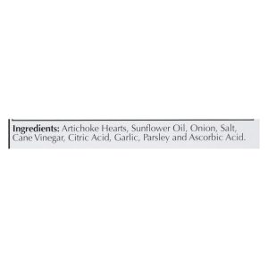ingredients : artichoke hearts;sunflower oil;onion;salt;cane vinegar;citric acid;garlic;parsley and ascorbic acid