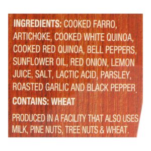 ingredients : cooked farro;artichoke;cooked white quinoa;cooked red quinoa;bell peppers;sunflower oil;red onion;lemon juice;salt;lactic acid;parsley;roasted garlic and black pepper