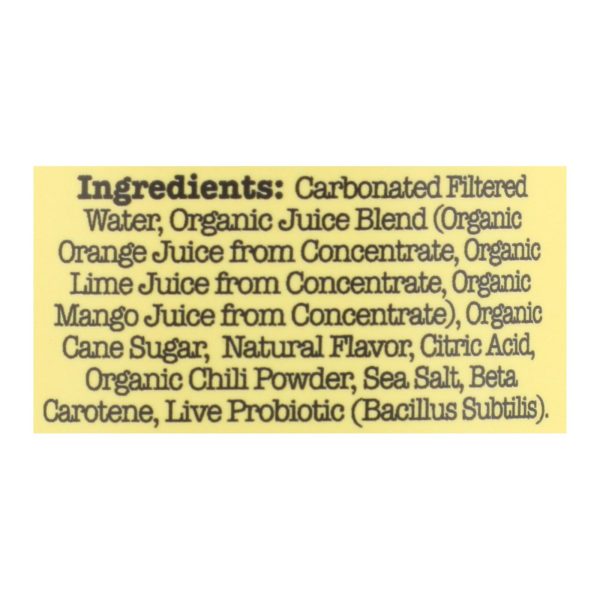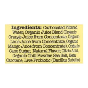 ingredients : carbonated filtered water;organic juice blend from concentrate (white grape, orange, lime & mango);natural flavor;citric acid;organic chili powder;sea salt;beta carotene;live probiotic (bacillus subtilis)