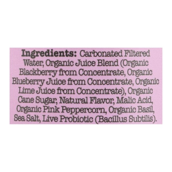 ingredients : carbonated filtered water;organic juice blend from concentrate (pear, blackberry, blueberry and lime);natural flavor;malic acid;organic pink peppercorn;organic basil;sea salt;live probiotic (bacillus subtilis)