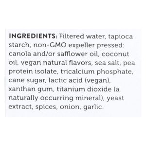 ingredients : filtered water;tapioca starch;expeller pressed: canola and/or safflower oil, coconut oil, vegan natural flavors, salt, pea protein, tricalcium phosphate, cane sugar, lactic acid (vegan), xanthan gum, titanium dioxide color (naturally occurring mineral), yeast extract, black pepper, onion, garlic, parsley