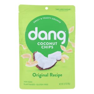 Dang coconut chips, original recipe are a healthy and delicious snack option. Made with coconut, cane sugar and salt as the sole ingredients, these coconut chips are free of unnatural and unnecessary additives. This product is gluten-free, vegan friendly and non-gmo. Each bag of dang coconut chips, original recipe weighs 3.17 oz. See nutrition facts panel for allergens.